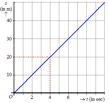 bekijken van een voorwerp dat met constante snelheid beweegt. Hiernaast zie je zo'n grafiek. Aan het feit dat het een rechte lijn is, kun je zien dat het punt met constante snelheid beweegt, immers de afstand neemt "gelijkmatig" toe. Hiernaast is de lijn y = 5x getekend. In dit geval wordt dat s = 5t want op de y-as (s-as) staat de afstand s en op de x-as (t-as) de tijd t (in seconden) Bij de rode stippellijn zie je dat na 4 seconden een afstand van 20 meter is afgelegd. Dat is dus een snelheid van 20/4 = 5 meter per seconde. En dat is ook de r.c. van de lijn, immers Dy = 20 en Dx = 4 dus de snelheid is Dy/Dx sn dat is inderdaad de r.c. van de lijn. |