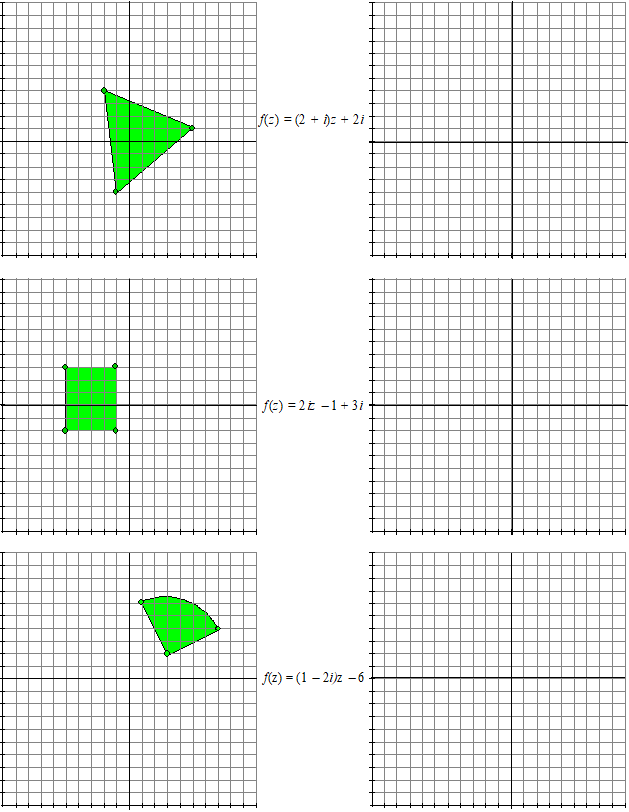 | Links staan de originelen, rechts de beelden daarvan bij de functie f(z) = 2z + 1. Door veel van deze vormen te bekijken krijg je misschien een beetje een idee van wat deze functie doet. Probeer dat maar eens in je eigen woorden te omschrijven aan de hand van deze plaatjes. Lastig hé? Misschien gaat het met de formule wel makkelijker dan met de plaatjes. Hieronder staat wat er ongeveer gebeurt. Denk eerst zelf na!!!! | ||||||||||||||||||||||||||||||||||