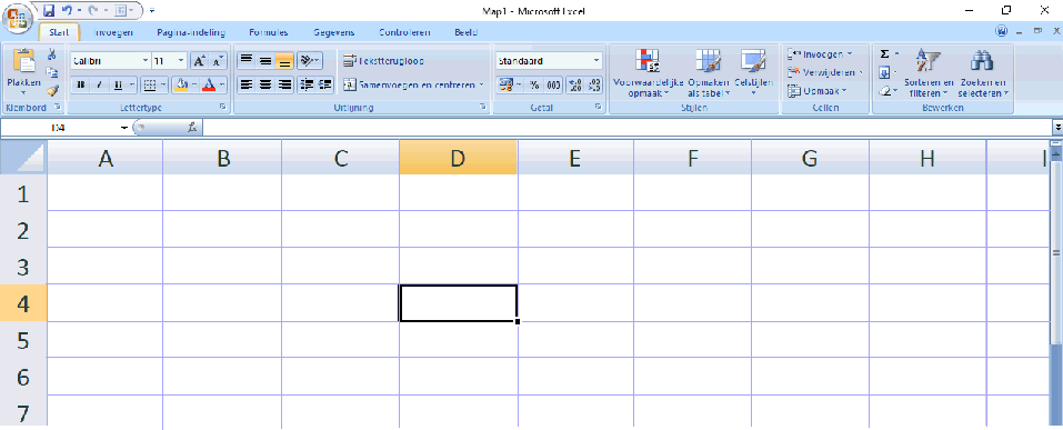 oefenen met het programma EXCEL. Ikzelf gebruik de versie EXCEL 2007. Intussen zijn er al nieuwe versies EXCEL: 2010, 2013, 2016, 2019, 2021 maar die verschillen niet zo heel veel van elkaar. Als er wezenlijke veranderingen zijn zal ik die melden. Open het programma en je krijgt dit te zien: |