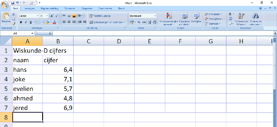 spreadsheet). Met de muis kun je een cel selecteren (je kun ook met de cursor door de cellen heen lopen). In het voorbeeld is cel D4 geselecteerd. Laten we er een tabel in gaan zetten..... Ik ga als leraar de wiskundecijfers van mijn wiskunde -D klasje erin zetten. Dat is een lekker klein klasje dus dat is weinig werk. In cel A1 zet ik de titel: Wiskunde-D cijfers, en in rij 2 de koppen: "naam" en "cijfer" In de eerste twee kolommen voer ik daarna de voornamen en de cijfers van mijn 5 leerlingen in: |