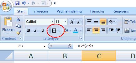 de enige aparte knop links bovenin. Je kunt hiermee aangeven of de cellen die je op dit moment geselecteerd hebt randen moeten hebben en zo ja waar en hoe dik. Klap hem maar uit; het wijst zichzelf wel. Laten we ons vooral gaan bezighouden met belangrijkere zaken......... |