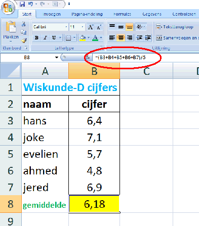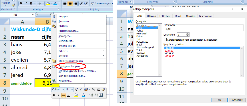 Ik wil natuurlijk graag uitrekenen wat het gemiddelde cijfer van mijn klas is. Daarvoor ga ik een formule in cel B8 zetten. Om het gemiddelde te berekenen moet ik de cellen B3 tm B7 bij elkaar optellen en dan delen door 5, dus die formule is: B8 = (B3 + B4 + B5 + B6 + B7)/5 Om die formule in cel B8 te krijgen selecteer je eerst cel B8, en daarna click je in witte werkbalk die direct boven de letters van de celnamen staat. Die bij de rode cirkel hiernaast. Dat noemen we de formulebalk want daar staan de formules. Formules beginnen in EXCEL altijd met "=" Dus in de formulebalk typ je: = (B3 + B4 + B5 + B6 + B7)/5 en daar verschijnt het gemiddelde in cel B8!!!! Het is 6,18. Rood omcirkeld zie je in de formulebalk de formule staan die ik heb ingevoerd. (tenminste als je cel B8 hebt geselecteerd). Celopmaak. Je kunt de opmaak van een cel (wat erin staat en in welke vorm) veranderen door de cel te selecteren en dan rechts te clicken. Dan krijg je het menu hier linksonder en als je kiest "celeigenschappen dan krijg je het submenu rechtsonder. Daarin kun je bij "getal" kiezen wat er in je cel staat (een gewoon getal, een datum, valuta noem maar op) Bij een gewoon getal kun je bijvoorbeeld aangeven hoeveel cijfers je achter de komma wilt (Decimalen staat in dit voorbeeld op 2). |