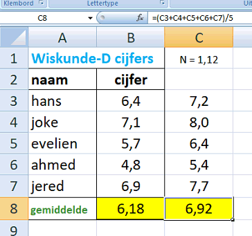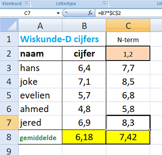 (uitleg voor later) en in C2 zet ik de 1,12. Nu maak ik in C3 voor Hans de formule: = B3*C2 Uiteraard geeft dat weer de 7,2 voor Hans. Maar als ik nu die formule met de vulgreep omlaag kopieer, dan gaat het fout! Zie je waarom??????? Dan wordt C4 voor Joke gelijk aan B4*C3 want die C2 schuift ook omlaag, en dat moet niet; het moet wel steeds C2 blijven. Je kunt voorkomen dat een celwaarde mee verandert als je er dollartekens voorzet. Probeer maar C3 = B3 * $C$2 Als je nu omlaag sleept verandert alleen de B3 mee en de C2 blijft C2 Zie de figuur hiernaast. Als je nu de cel C2 verandert (dus een andere N-term kiest zoals hiernaast N = 1,2) dan verandert alles in één keer mee. Dus alle cijfers plus het gemiddelde worden in één keer aangepast. Handig toch? En als je bijvoorbeeld $A3 naar beneden sleept verandert allen de 3, en niet de A. En bij D$2 verandert allen de D en niet de 2. |