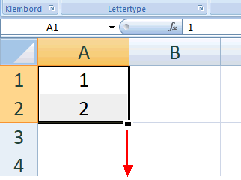 in kolom A Dan kun je dat natuurlijk gewoon één voor één doen, maar het kan sneller: Zet in cel A1 het getal 1 Zet in cel A2 het getal 2 Selecteer nu beide cellen samen (zie hiernaast). De vulgreep staat dan onderaan beide cellen samen. Als je die nu omlaag trekt krijg je alle cijfers 1,2,3,4,5,6,7........ net zolang als je maar doorgaat! En als je begint met 2,5 dan krijg je 2,5,8,11,14,...... COOL toch? |
