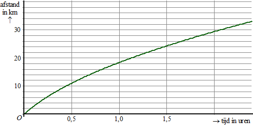 | Hiernaast zie je de grafiek van de afstand (in km) die een fietser heeft afgelegd vanaf het tijdstip van vertrek (t = 0, t in uren) | |||||