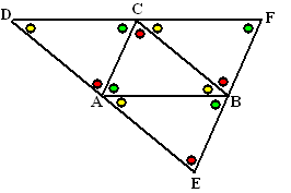 grotere driehoek zoals hiernaast. Doe dat zo dat de zijden van de grotere driehoek evenwijdig zijn aan die van de kleinere. Dan zijn de hoeken met dezelfde kleur hiernaast gelijk (zoek het zelf maar uit: het zijn allemaal Z-hoeken) Dat betekent dat de driehoeken allemaal congruent zijn met de middelste driehoek (HHZ) dus ook congruent aan elkaar. Kennelijk zijn A, B en C de middens van de zijden van driehoek DEF. |