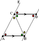 gelijk, zoals in de figuur hiernaast met gelijke kleuren is aangegeven. ∠ECD = ∠BDC omdat de drie kleuren samen 180º zijn (hoekensom driehoek en gestrekte hoek bij C). Maar dan zijn ∠ECD en ∠BDC ook Z-hoeken, dus zijn de lijnen AC en BD evenwijdig. Volgens de congruentie waren ze ook al even lang. |