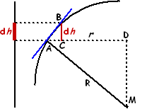 en stel dat de straal van het cirkelstrookje gelijk is aan r. Hiernaast is de raaklijn (blauw) in A aan de bol getekend. Die staat loodrecht op MA. Als dh maar klein genoeg wordt gekozen dan is deze raaklijn ongeveer gelijk aan de lijn AB. De driehoeken BAC en AMD zijn gelijkvormig (bewijs dat zelf maar!) Dan geldt: AD/MA = BC/AB ofwel r/R = dh/AB |