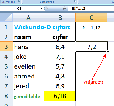 Vulgreep. Stel dat ik als leraar deze toets wat op wil waarderen door een N-term van 1,12 in te voeren. Dat betekent dat ik elk cijfer met 1,12 vermenigvuldig zodat iedereen er 12% bij krijgt. Aardig toch? Nou, dan zet ik in cel C1 de uitleg N = 1,12 (dan weet ik later nog wat er in deze kolom staat) En dan ga ik in cel C3 staan en vervolgens voer ik de formule " = B3 * 1,12" in bij de formulebalk. Ik moet immers het getal uit B3 (=cijfer van hans) met 1,12 vermenigvuldigen...... Dan verschijnt er in cel C3 voor Hans het opgewaardeerde cijfer 7,168. Ga dat zelf maar na. OK, Hans kan geen 7,168 hebben (wij geven cijfer op 1 decimaal) dus ik ga afronden op 1 decimaal via rechtsklikken - celeigenschappen - getal - 1 decimaal. Dat geeft de figuur hiernaast. Hans heeft een 7,2. Nu wil ik graag die formule voor Hans naar alle andere leerlingen kopiëren. Dat kan met de vulgreep. Dat is dat kleine blokje rechts onderaan cel C3 (ik heb het hiernaast iets groter weergegeven dan het is) Ga met je cursor op dat blokje staan, dan verandert het in een plusje ( + ) Pak dat plusje vast door links te klikken en sleep het omlaag naar de cellen C4 tm C7, dan gebeurt er iets wonderbaarlijks!!!!! |