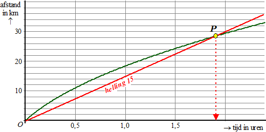 | Bij de pijl kun je aflezen dat na ongeveer 1,9 uur de fietser een gemiddelde snelheid van 15 km/uur heeft gehad. | |||||