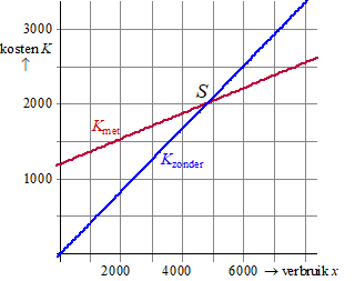 gelukkig erg makkelijk; Y1 = 1200 + 0,17X Y2 = 0,42X Cacl - intersect levert dan x = 4800 en y = 2016 Dat betekent dat de kosten gelijk zijn bij een verbruik van 4800 Kwh en die kosten zijn dan €2016 per jaar. De oplossing van de ongelijkheid is dus x > 4800 (want dan ligt de rode lijn onder de blauwe). |