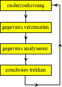 fatsoenlijk statistisch onderzoek verloopt altijd in vier etappes. Het begint allemaal met een onderzoeksvraag, ofwel: "Wat willen we met dit onderzoek ontdekken?" Daarop volgt het verzamelen van gegevens die nodig zijn om die vraag te beantwoorden. Vervolgens gaan we die gegevens analyseren, en tenslotte trekken we conclusies uit onze analyses. Na die conclusies kunnen weer nieuwe vragen zijn opgedoken, waardoor het hele stappenplan opnieuw kan beginnen. Daarom spreken we van de statistische cyclus. Laten we de 4 stappen van die cyclus even één voor één bekijken: |