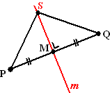 die middelloodlijn. Dan geldt: • PM = QM (M was immers het midden van PQ) • SM is een zijde van driehoek PSM, en ook van driehoek QSM • ∠PMS = ∠QMS = 90º Maar daaruit volgt dat de driehoeken PSM en QSM congruent zijn (zijde-hoek-zijde) |