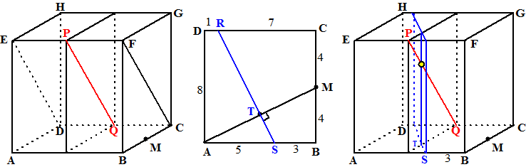 zelf maar na) Teken tenslotte in de kubus de snijlijn van dit middelloodvlak met lijn PQ. Dat geeft het gele punt in de rechterfiguur en dat is het middelpunt van de gezochte bol. |