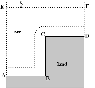 maakt bij kaap K een hoek van 90º; een deel van de kustlijn loopt