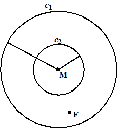 De ellips e heeft brandpunt F en richtcirkel c1.