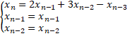 matrixvermenigvuldiging. Dat is het makkelijkst uit te leggen met een voorbeeld. Neem de (derde orde) differentievergelijking: xn = 2xn - 1 + 3xn - 2 - xn - 3 met x0 = 1 en x1 = x2 = 1 Dan kun je daar supermakkelijk het volgende stelsel vergelijkingen van maken: |