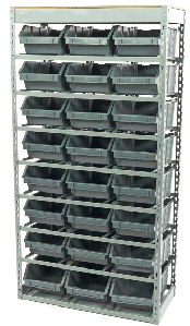 staat een stellage met daarin 24 opbergbakken voor gereedschap.