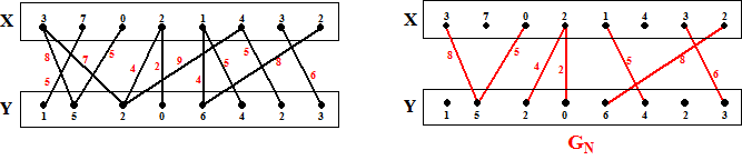 = 5 Eerst gaan nu we alle knooppunten een nieuw nummer N geven, en dat doen we zó dat N(Xi) + N(Yj) ≥ wij . Ofwel: de nummers van de eindpunten van een verbindingslijn zijn samen altijd minstens gelijk aan het gewicht van die verbindingslijn. Knooppunten mogen daarbij best dezelfde nummers hebben, dat doet er niet toe. Dat lukt altijd. (Je kunt bijvoorbeeld heel flauw elke Yi nummer 0 geven en elke Xi het nummer van de grootste (qua gewicht) verbindingslijn die er aan zit). De verzameling van verbindingslijnen V waarvoor het gelijkteken geldt (dus N(Xi) + N(Yj) = wij) noemen we VN. En de subgraaf die bestaat uit al die lijnen en bijbehorende knopen van VN noemen we de gelijkheids-subgraaf GN die hoort bij deze nummering N. Zó dus bijvoorbeeld: |