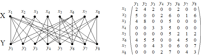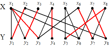 | Deze stelling is de basis van het volgende algoritme om een optimale matching te vinden. Het komt van Kuhn en Munkres, en gaat als volgt: | |||||||||||||||||||||||||||||||
