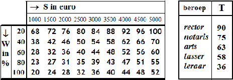 De tabel linksonder laat zien hoe T van W en S afhangt. Zo zie je