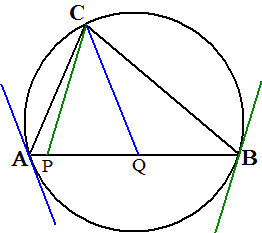 In punten Q en R wordt de raaklijn aan die cirkel getekend.
