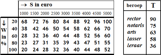 De tabel linksonder laat zien hoe T van W en S afhangt. Zo zie je