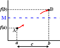 dat je dan ergens tussen a en b elke blauwe lijn M moet