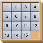 schuifpuzzeltje hiernaast is van Sam Lloyd. Je moet de getallen door te schuiven in de goede volgorde krijgen. Stel nu dat in de situatie hiernaast 14 en 15 worden omgewisseld. Kun je dan door schuiven de goede eindsituatie weer krijgen? Nee dat kan niet, en dat kun je als volgt zien. Noem het blokje rechts onderin BLANCO. Dan bestaat een zet (schuiven) uit een verwisseling van BLANCO met een ander nummer. Maar als BLANCO op het eind weer rechts onderin moet zitten, moeten er een even aantal verwisselingen zijn geweest (kleur de velden maar om en om zoals op een schaakbord zwart en wit, dan zie je dat BLANCO steeds van zwart naar wit en weer naar zwart gaat, dus na een even aantal zetten staat hij steeds weer op zijn beginkleur). |