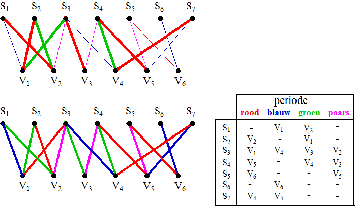 4 lokalen in periode groen 3 lokalen en in periode paars ook 3 lokalen. In totaal worden er 16 lessen in 4 periodes gegeven, dus dat zou moeten kunnen in 4 lokalen!! Laten we rood en groen gelijker gaan maken. Er zijn twee rood-groene paden die in aanmerking komen, want die beginnen met rood en eindigen ook met rood, namelijk S1V2S2V1S3V3 of S7V4S4V5 Laten we van de eerste route alle kleuren rood-groen wisselen: |