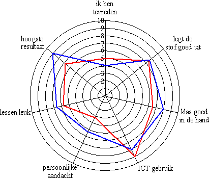 leraren, rood de scores van deze leraar. Hoe verder naar buiten hoe