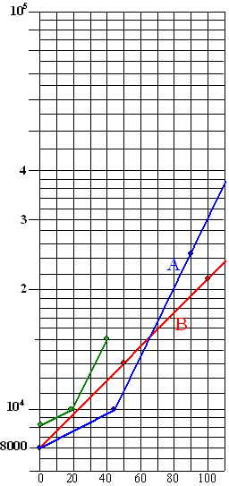 staat er 100000 op de rekening en vanaf dan groei het met 2%) De B-grafiek heeft B = 8000 1,01t 10000 1,02t - 45 = 8000 1,01t 10000 1,02t 1,02-45 = 8000 1,01t 1,02t 4101,97 = 8000 1,01t (1,02/1,01)t = 8000/4101,97 1,0099t = 1,9503 t = log(1,9503)/log(1,0099) = 68 jaar |