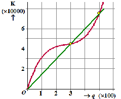 | d. | MK is de helling van de raaklijn GK is de helling van de lijn naar de oorsrpong Die zijn gelijk als de raaklijn aan de grafiek door de oorsprong gaat. Zie de groene lijn hiernaast. q is iets meer dan 2000 |