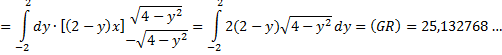integreer langs zo'n bruin lijntje Dat is van z = 0 tot z = 2 - y Zie de figuur rechts (het bovenaanzicht) : tel nu die bruine lijntjes op, dat is integreren in de x-richting (het blauwe vlak maken). x loopt daarbij van -√(4 - y2) tot √(4 - y2) Tel tenslotte alle blauwe vlakken in de y-richting op: y loopt van -2 tot 2. |