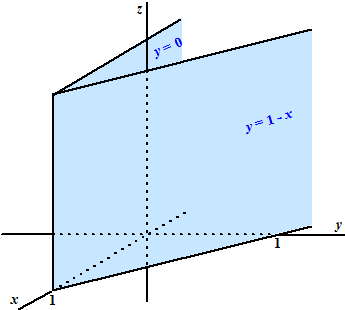 | 4. | Begin van binnenuit. y is geďntegreerd van 0 tot 1 - x Dat betekent dat y dus steeds tussen de vlakken y = 0 en y = 1- x in ligt. Dat geeft het gebied tussen beide blauwe vlakken hiernaast (in de z-richting nog onbegrensd) |