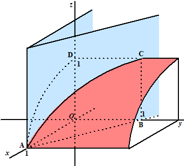 geďntegreerd van 0 tot 1 - x2 z = 1 - x2 is een cilinder met als as de y-as en als straal 1. Snijden met de beide blauwe vlakken hierboven geeft de figuur hiernaast. De doorsnede is figuur ABCDO waarbij de kromme AC de snijlijn van het cilindervlak en een blauw vlak is. Bedenk dat de figuur naar achteren nog doorloopt (de rode cilinder loopt door voor x < 0) Pas bij de derde integraal moet x tussen 0 en 1 liggen, dus wordt de figuur afgesneden volgens het Oyz vlak. Het uiteindelijke lichaam is ABCDO |