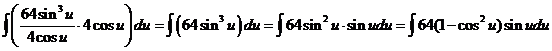een minteken na gelijk aan de afgeleide van cosu, dus een primitieve is dan -64cosu + 64/3 · cos3u terug naar x: sinu = x/4 geeft cosu = 1/4√(16 - x2) (weer met zo'n driehoekje) dan is de primitieve: F = -16√(16 - x2) + 1/3(16 - x2)1,5 |
