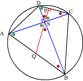 gelijke letters in gelijke hoeken, allemaal vanwege omtrekshoeken a van koorde AD, b van koorde DC, c van koorde BC en d van koorde AB. Vanwege Thales is ∠DAB = 90º (DB is een middellijn) De driehoeken DSP en DAB zijn gelijkvormig, dus is ∠DPS = a ∠PQC = c + d + a (buitenhoek driehoek PDQ) Dan is ∠PQC + ∠PAC = a + b + c + d Dat is 180º omdat dat gelijk is aan ∠ABC + ∠ADC en ABCD was een koordenvierhoek. omdat ∠PQC + ∠PAC = 180º is PACQ een koordenvierhoek. |