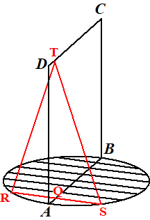 het midden van de grondcirkel M. QM = 3/4 • straal = 3 MR = straal = 4 Dus QR2 = 42 - 32 = 16 - 9 = 7 QR = √7 RS = 2√7 Teken een gelijkbenige driehoek waarvan de basis 2√7 is (5,29) en de hoogte 8. Handig (zonder wortels te moeten meten) zoals hieronder: Begin met lijn stuk MQ = 3 Teken een cirkel met middelpunt M en straal 4. Snij die met de lijn door Q loodrecht op MQ MT = 5 De rode driehoek is de gezochte. |