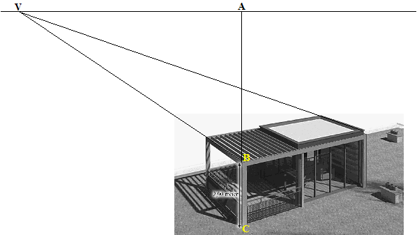 een verdwijnpunt V (bijv links zoals hierboven) Dat geeft de horizon. In mijn tekening gold (meten): BC = 3,14 AC = 10,2 |
