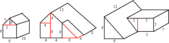 plus het aangebouwde rode prisma. Voorvlak: twee driehoeken plus een rechthoek Oppervlakte voorvlak 4 • 6 + 1/2 • 4 • 4 + 1/2 • 10 • 10 = 82 Hoogte is 12 dus inhoud 12 • 82 = 984 Aangebouwde rode prisma: voorvlak 1/2 • 6 • 6 = 18 Hoogte is 4, dus inhoud 4 • 18 = 72 De inhoud van het huis is dan 984 - 72 = 912 |