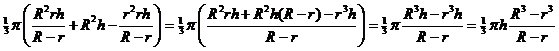 + x) = r/x Rx = r(h + x) Rx = rh + rx Rx - rx = rh x(R - r) = rh x = rh/(R - r) Hele kegel: 1/3 • π • R2 • (x + h) onderste deel: 1/3 • π • r2 • x Afgeknotte kegel: 1/3πR2 (x + h) - 1/3πr2x = 1/3π(R2x + R2h - r2x) Vul nu voor x de waarde hierboven in: |