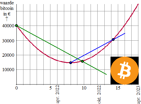 | d. | Met de grafiek: De groene lijn heeft helling -30/12 = -2,5 Die snijdt de grafiek bij t = 9 Met de formule: Lijn vanaf (0, 40) met helling -2,5 heeft vergelijking y = -2,5x + 40 Snijden met 0,4x2 - 6,4x + 40,4 Dat geeft x = t = 9,65 maanden |