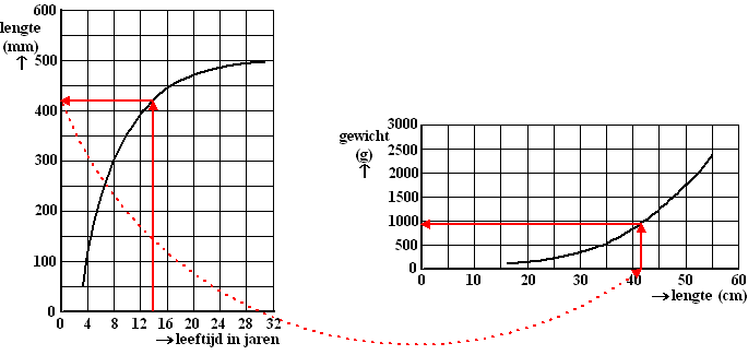 | Door deze grafieken te combineren is te achterhalen wat het gewicht is van een vrouwtjesschol als je de leeftijd kent. | ||||||