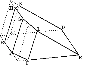 getekend dat BC = AE = 3 (dus op schaal 1,5 cm) Vanuit C en E zijn lijnen recht omhoog getrokken totdat een hulplijn (gestippeld) vanuit L,K van het andere aanzicht gesneden wordt. Hetzelfde is gedaan vanuit B en A totdat de hulplijn vanuit G,H gesneden wordt. |