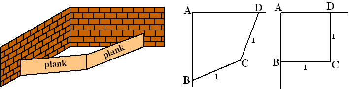 Zie de figuur hieronder. De planken worden zo geplaatst dat het bovenaanzicht van de zandbak een symmetrische vierhoek is. In de figuren rechts is van twee mogelijke situaties het bovenaanzicht op schaal getekend. In de volgende vragen worden de hoeken steeds in radialen uitgedrukt. |