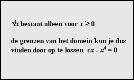 = (cx - x4)0,5 De kettingregel geeft dan h '(x) = 0,5 • (cx - x4)-0,5 • (c - 4x3) Voor een maximum is de afgeleide nul: 0,5 • (cx - x4)-0,5 • (c - 4x3) = 0 Alleen het laatste deel hiervan kan nul worden. (c - 4x3) = 0 levert met x = 1,5 dat c - 4 • 1,53 = 0 ⇒ c - 13,5 = 0 ⇒ c = 13,5 |