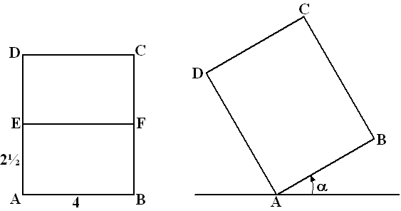 | Op een ander moment is de tank voor de helft met olie gevuld. In de figuur links hieronder is een vooraanzicht van de tank (rechthoek ABCD) en de | ||||
