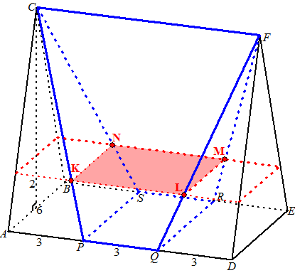 Gegeven is het prisma ABC.DEF. De punten P en Q liggen op de ribbe AD zodanig dat AP = PQ = QD = 3 cm. De punten R en S liggen op de ribbe BE zodanig dat BS = SR = RE = 3 cm. Deze opgave gaat over het lichaam PSC.QRF. Zie de figuur. |