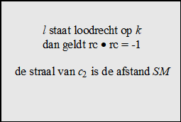 = -8 x2 - 4x + 4 - 4 + y2 - 6y + 9 - 9 = -8 (x - 2)2 + (y - 3)2 = 5 M = (2, 3) Lijn loodrecht op k heeft r.c. -2 y = -2x + b door punt (2,3) geeft 3 = -4 + b dus b = 7 l is de lijn y = -2x + 7 dus S = (0, 7) en dat is het middelpunt van c2 MS = √(22 + 42) = √20 en dat is de straal van c2 c2 is de cirkel x2 + (y - 7)2 = 20 |